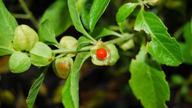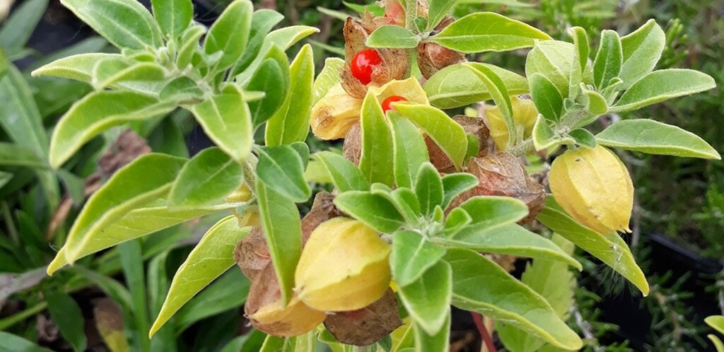 L’Ashwagandha ou ginseng indien est un plante vivace ligneuse, d’environ 1m/1m50. Feuilles entières, ovales, typiques des Solanacées. Fleurs jaune vert accolées à la tige. La floraison a lieu entre juin et septembre. Fruits en baies, d’abord oranges puis devenant rouges à maturité et protégés par un calice.