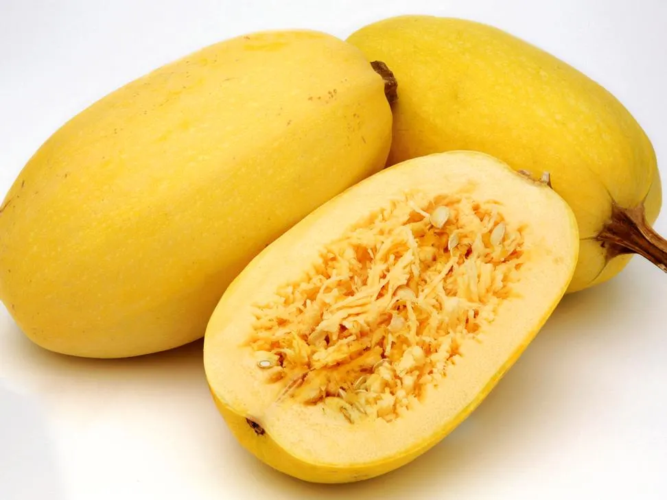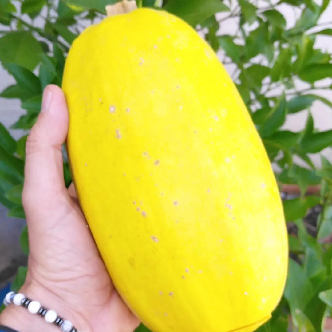 Courge peu coureuse, jaune orangé à chair possédant la texture du spaghetti. Chaque pied produit 2 à 5 fruits de 2 à 4 kilos pour 25 cm de longueur en moyenne. Elle se récolte tout l’été jusqu’en octobre.