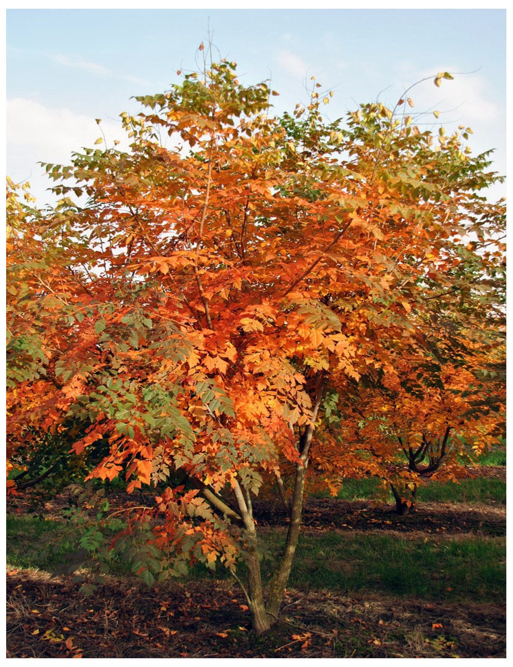 Feuillage penné naissant rouge-rose, devenant gris-vert en été, puis jaune à l’automne.